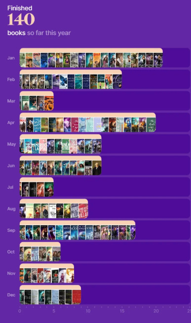 This is the third year I’ve faithfully tracked my reading, and it’s such a delightful habit that I think I’ll keep doing it. Scrolling through the titles in order, I can remember not only the story, but also the events and emotions that passed while I was reading it. In some months I have only a few titles recorded, because I was savoring audiobooks. In other months, I read dozens, which either means I had some extra downtime or I was binge-reading a particular author or series.
